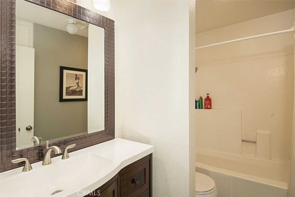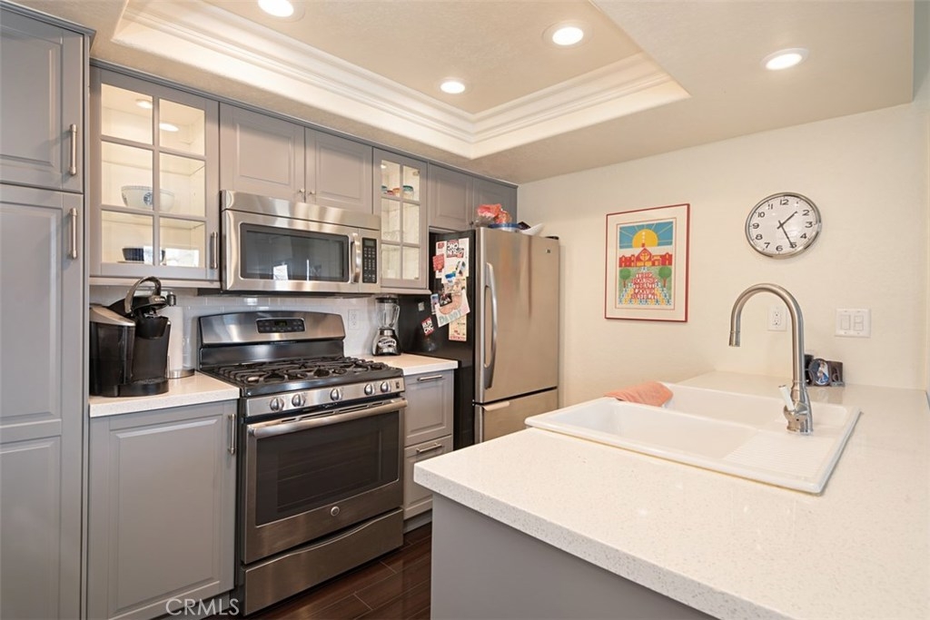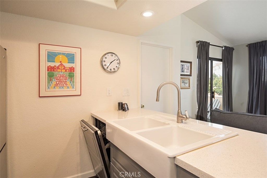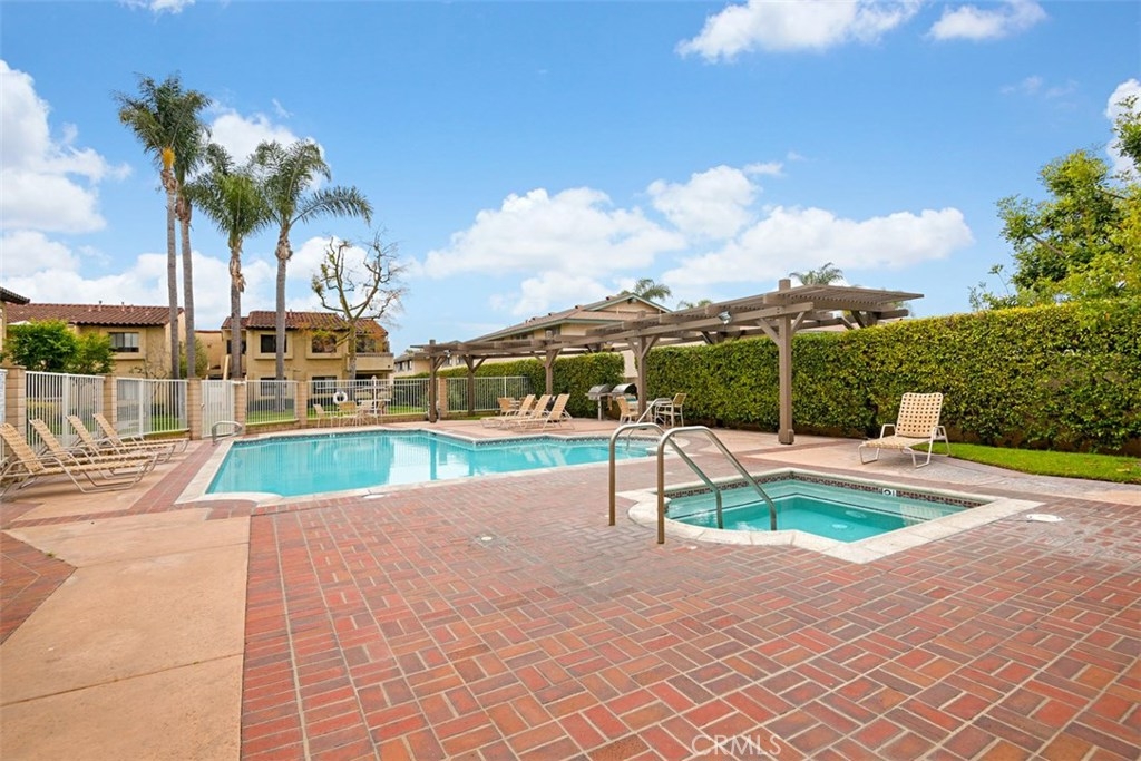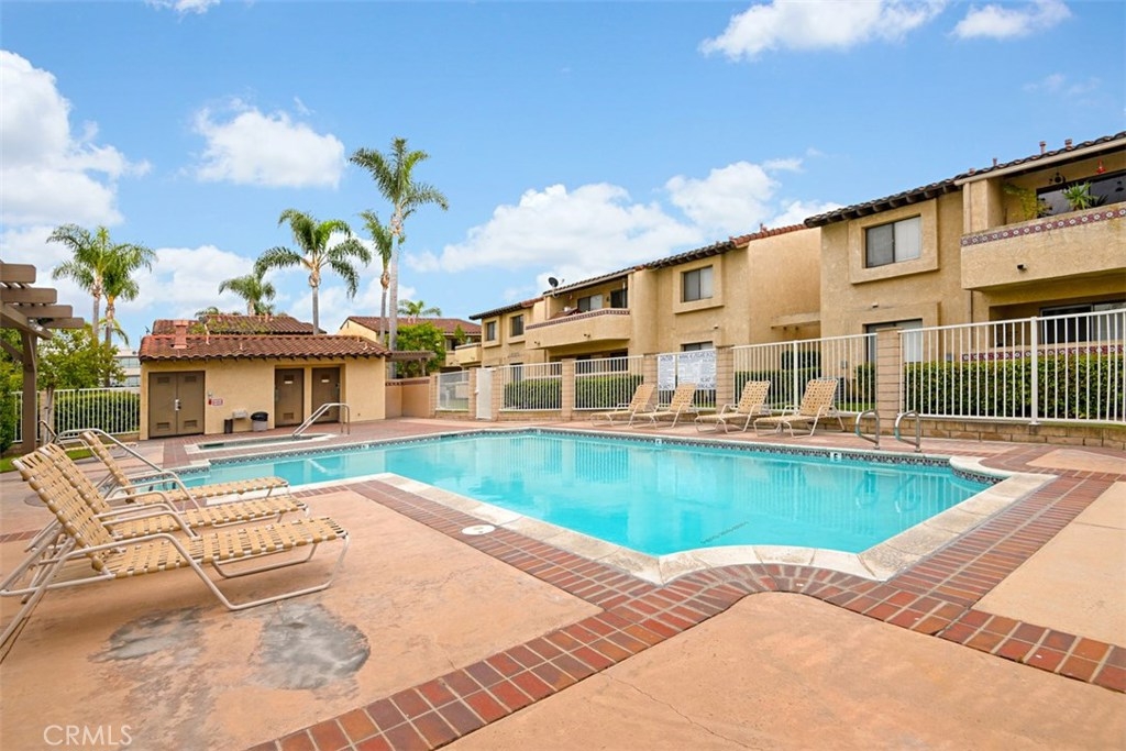 This darling condo has been remodeled and offers 2 Bedrooms and 2 baths. Beautiful kitchen with rich warm lighted cabinets, quartz counters, stainless steel appliances, tile back splash and recessed lighting. Family room has laminated wood flooring with a view of a pool. Nice size secondary bedroom with spacious closet. Master bedroom has its own bathroom. Bathrooms have new flooring and vanity. Pre-wired for AC, high vaulted ceilings, lovely patio, inside laundry and more! Great neighbors, conveniently located near shopping center and restaurants, this home has it all!