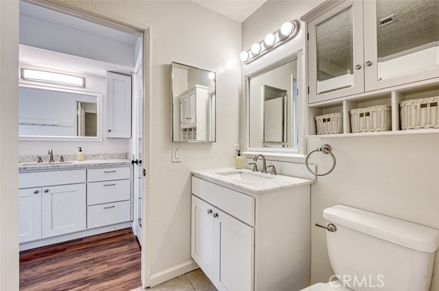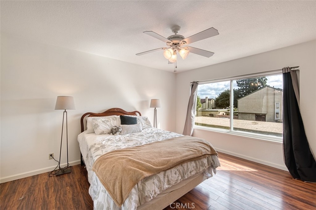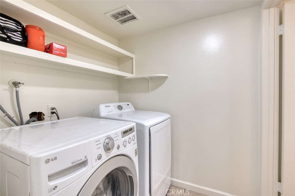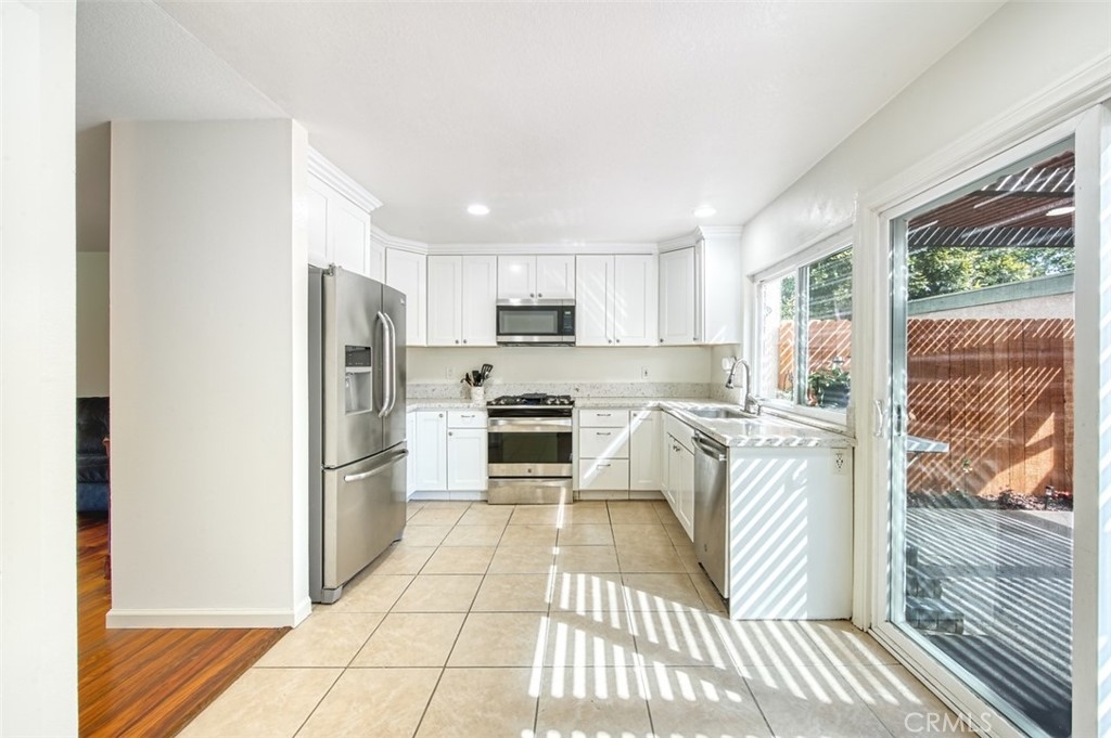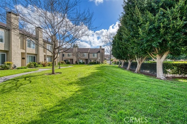 JUST LISTED IN THE GATED COMMUNITY OF FOUNTAIN PARK! This 3 bedroom, 1.5 bath two-level home offers nearly 1,400 sqft of interior living space and a quiet, inside-tract location. Features include dual-pane windows and sliders throughout, tile & laminate flooring, inside laundry with included washer/dryer, downstairs powder room for guests, and a cozy gas fireplace in the spacious main living area. Also includes an updated kitchen with granite countertops & backsplash, stainless steel appliances, recessed lighting, white shaker cabinetry and convenient nook for a small kitchen table. Just off of the kitchen is a private covered outdoor patio - perfect for parties & friends - and direct access to the large 2-car garage with roll-up garage door. Upstairs are three big bedrooms, the master at the back with mirrored wardrobe doors, overhead cooling fan, walk-in closet, and en-suite granite countertop vanity with shaker style cabinetry. The upstairs bathroom has been tastefully updated to match the master bedroom sink area and includes a second vanity, shower over tub and commode. Finishing the upstairs is a linen/storage closet at the landing and two additional large bedrooms. The Fountain Park community offers lots of greenbelts and mature landscaping, along with a community pool and clubhouse - all right across the street from the famous Mile Square Regional Park!