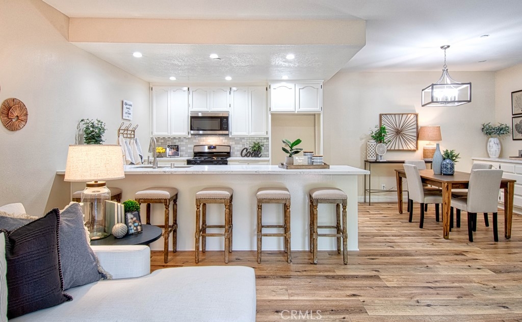 Enter the grand sized and elegant living area with open layout and high ceilings. The huge kitchen peninsula with gorgeous quartz countertops, brand new stainless appliances, and beautiful new flooring throughout is a dream space for entertaining. Dining room has a beverage bar with expansive cabinetry and a stainless bar sink. The lovely statement wall in the living room has a custom gas fireplace with mantle and stone surround, flanked by built-in bookshelves and abundant storage. Two additional storage closets are in the extensive hallway, leading to the large walk-in laundry room with upper cabinetry. Brand new water heater and completely updated HVAC system. Both bedrooms have walk-in closets, and the master suite has been divided into two spaces, creating an office/bonus room, a very desirable addition. Resort style living with a view of the swimming pool and lush tropical landscaping. Only steps from the jacuzzi spa area, bbqs, and directly adjacent to the fenced in dog park and children’s play area. Full country club amenities at Los Cab Sports Club just next door. This is one of the largest two-bedroom two-bath units in all of Los Caballeros. A beautiful space and opportunity! It will go fast!!