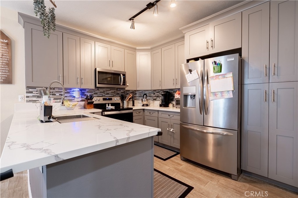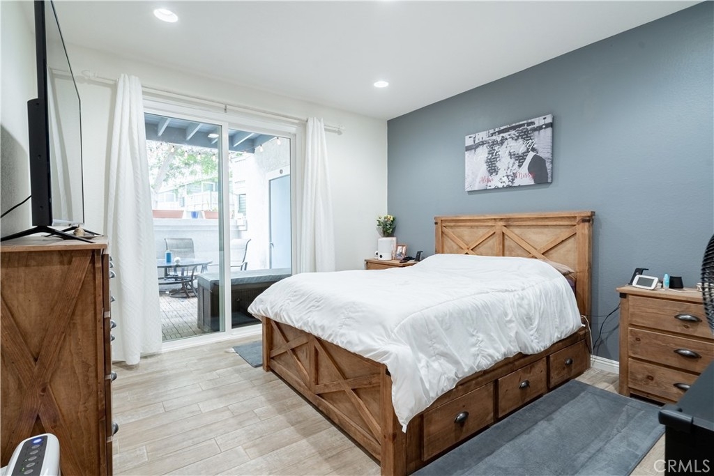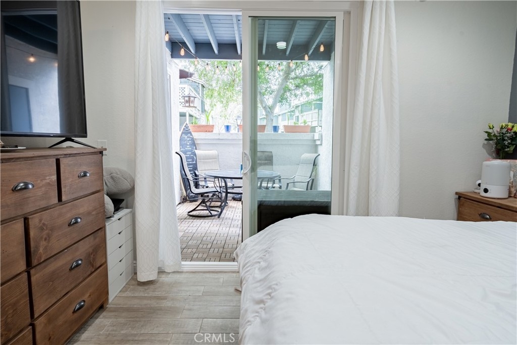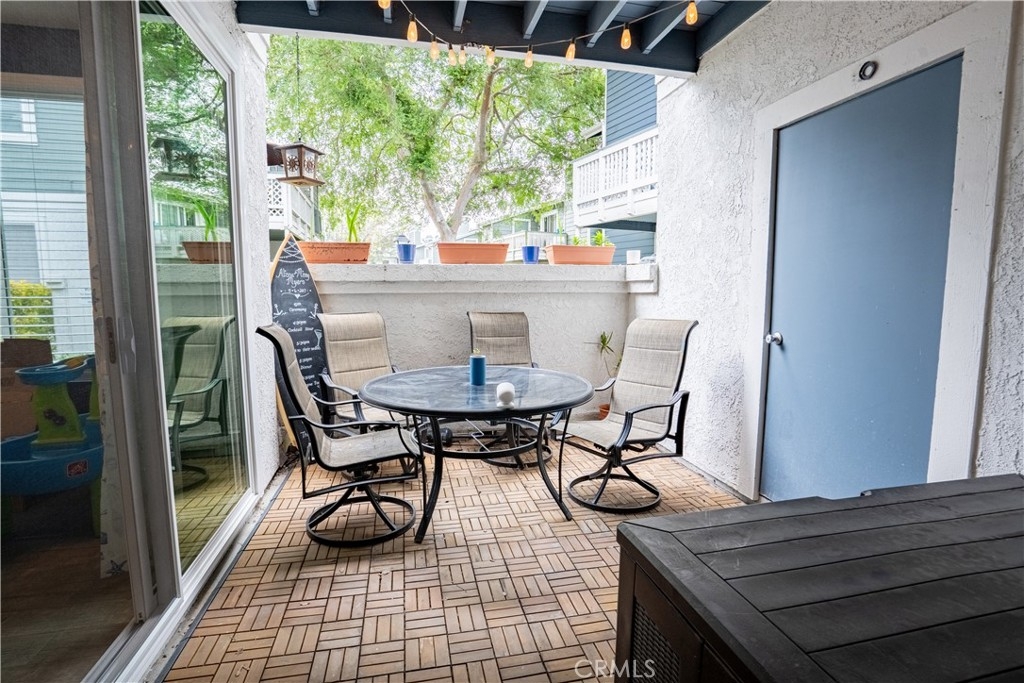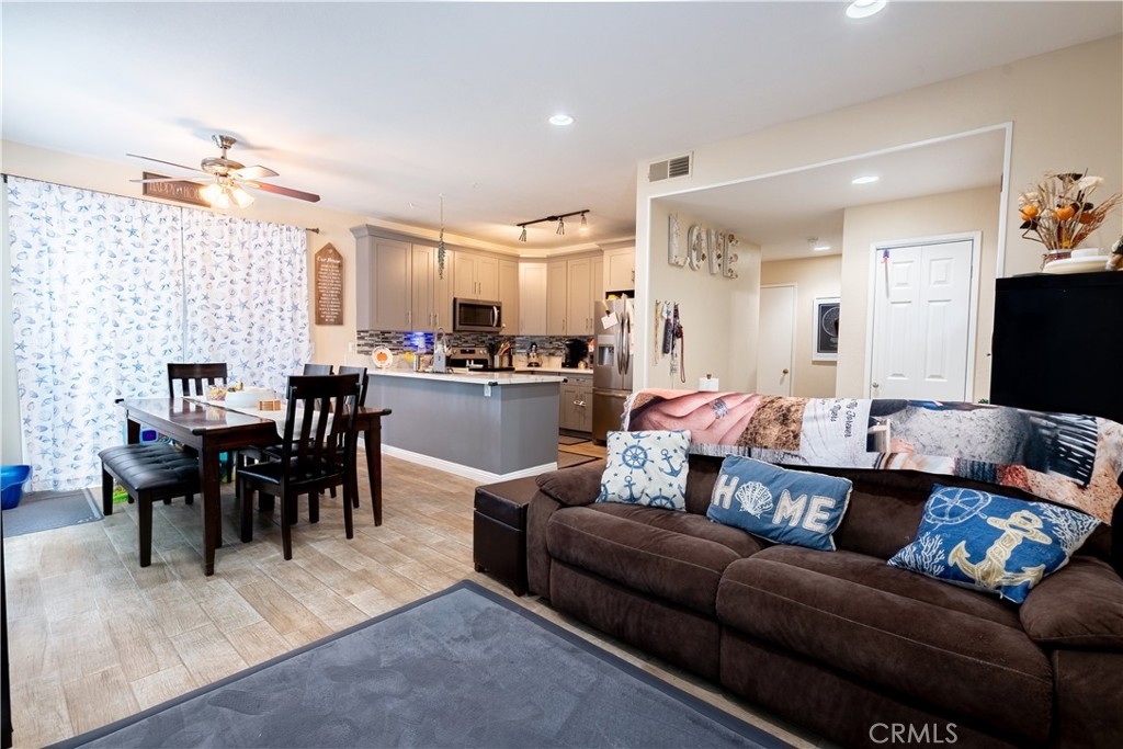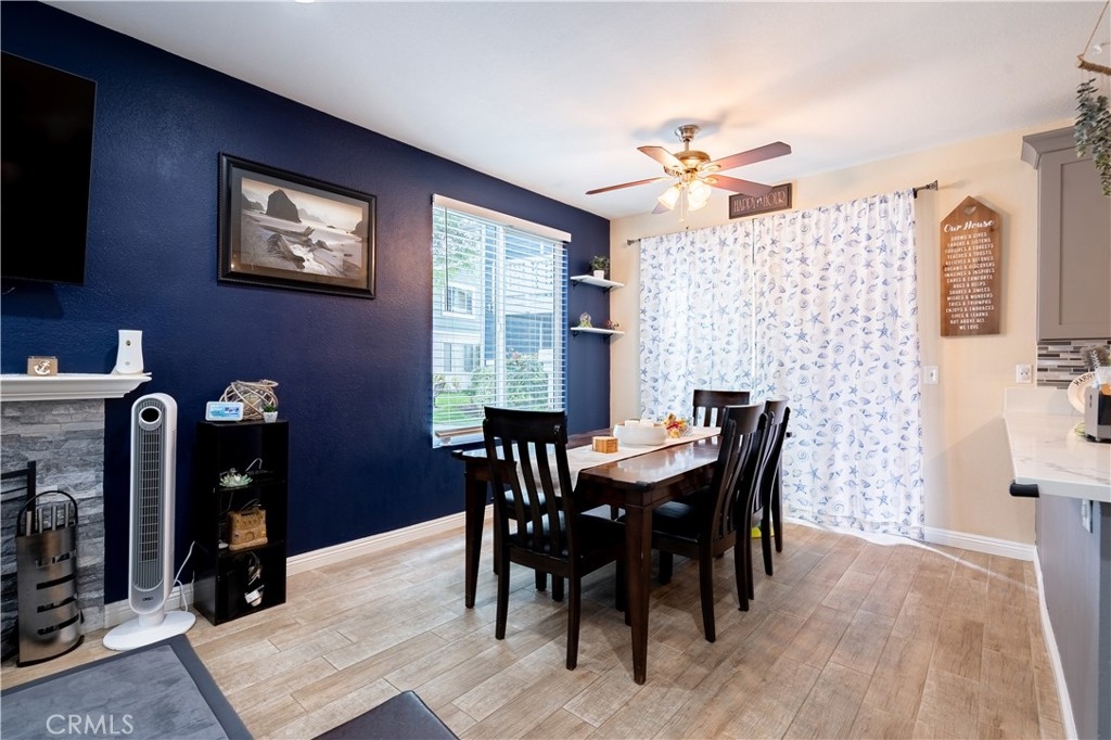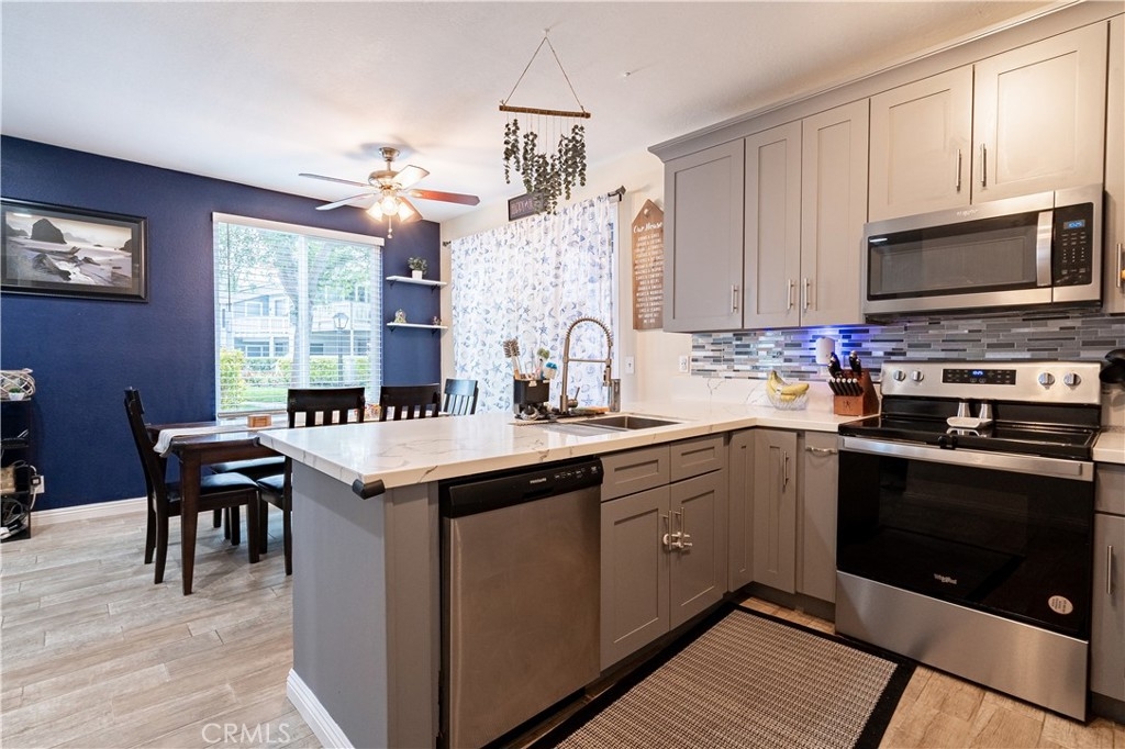 Nestled in the Gated New Chase Condominiums, this 2-bedroom, 1.25-bath ground floor condo is move-in ready and brimming with natural light. Newly installed large windows and sliders create an airy, open feel, complemented by wood-like porcelain tile floors, central AC/heat, ceiling fans, and recessed lighting. The inviting living area features a fireplace and sliding doors to a private porch. The updated kitchen shines with quartz countertops, custom gray cabinetry, modern appliances, and a breakfast counter that opens to the dining and family rooms. The primary bedroom offers a walk-in closet, sink vanity, plenty of light, and additional patio access. The full bathroom has recently been remodeled with new vanities, custom tiled shower and tub and has a bluetooth speaker in the light/vent fan. A hallway laundry closet for stackable units and extra patio storage add convenience. This pet-friendly community has an abundance of amenities including a freshly re-plastered pool and spa. Low HOA fees cover hot and cold water, sewer, and trash. Parking is easy with an assigned carport and ample open spaces. Located near top-rated schools, freeways, Mile Square Park, and shopping, this turnkey condo offers comfort and convenience in a prime Fountain Valley location. FHA/VA Approved Complex.