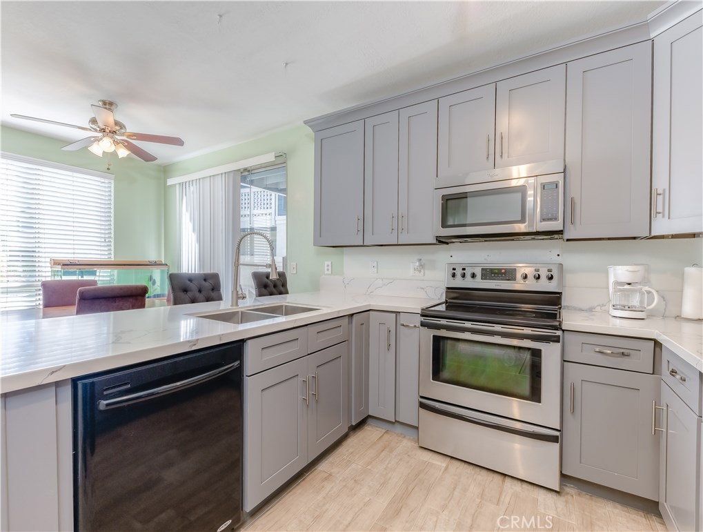 An exciting opportunity to own an amazing unit in the New Chase gated community complex! Downstairs condo with 2 bedrooms and 1.25 baths. Porcelain tile floors throughout, ceiling fans and recessed lighting. Living room is welcoming and has a cozy fireplace. The kitchen features Quartz counter tops, gray custom cabinets, upgraded appliances, breakfast counter to separate the dining area. Master bedroom has a walk-in closet, personal sink vanity, lots of natural light and access to the patio. Hidden inside laundry area in the hallway closet. Extra storage space is located on the covered patio. Community amenities include a pool and spa. Low HOA pays for trash and water. This bright and airy home is centrally located near restaurants, shopping centers and Mile Square Park.