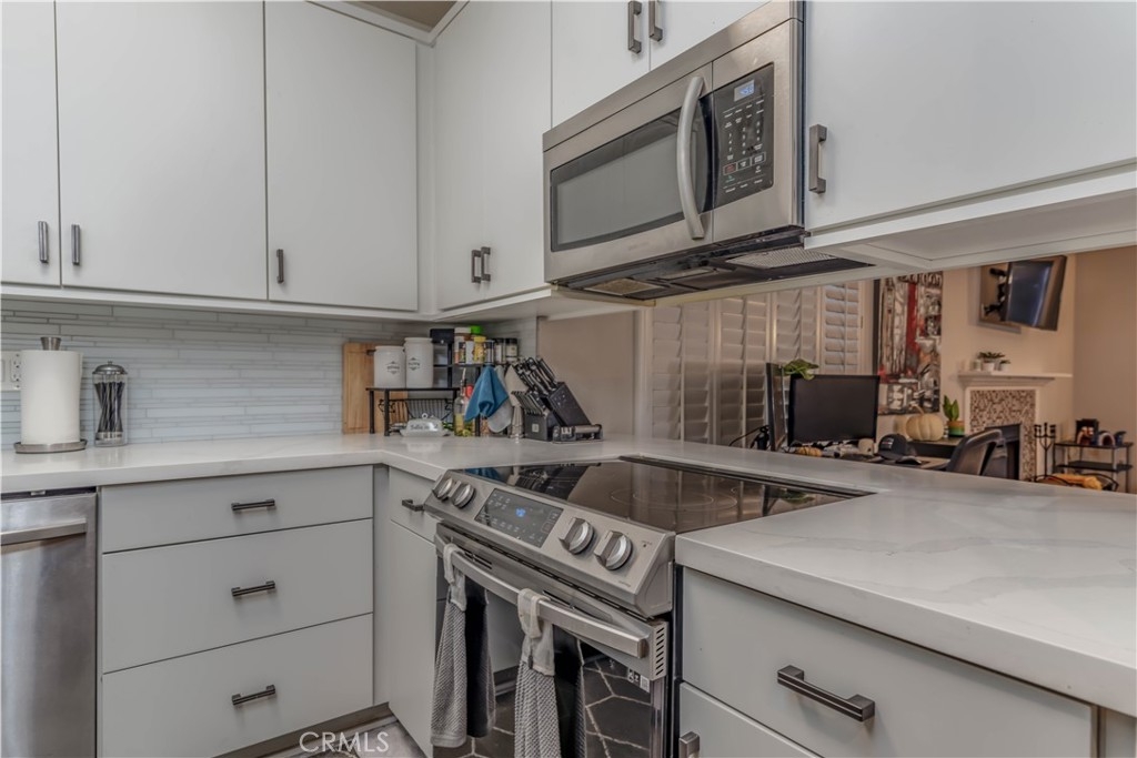 This downstairs 2 bed, 2 bath condo nestled in the quiet New Chase condo community features great amenities such as included water and trash, gated access, pool/spa and more! As you step through the front door, you are greeted by a convenient storage closet on your right and the kitchen to your left. The kitchen is complete with an electric stove top, oven, and a built-in microwave. The kitchen's efficient layout provides ample counter space and storage. Continue further into the home, and the spacious living room unfolds before you, featuring a cozy fireplace and sliding patio doors that open to the outside. Tucked in the hallway, you'll be met with a full guest bathroom, guest bedroom and the primary suite. The primary suite boasts dual sinks, allowing for convenient morning routines, a mirror closet for ample storage, and a toilet tucked behind a privacy door. Unit features newer HVAC and laundry hookups in unit, found behind closet doors. Convenient central location just a short drive from entertainment, shopping, and more such as Mile Square Park, 405fwy, South Coast Plaza, Costco and more! Includes 1 assigned carport parking space, and one parking pass first come first servie.