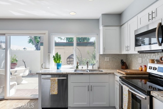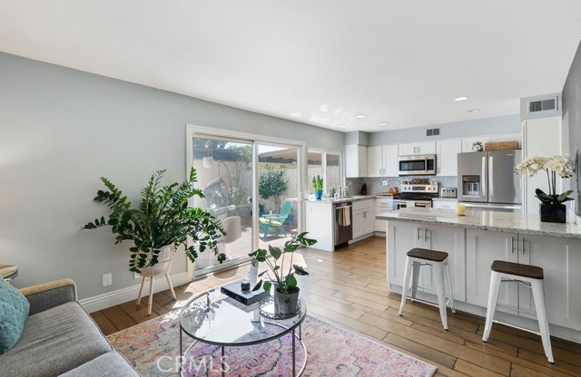 Outstanding 3 Bedroom 2.5 Bath 1656 square feet Monterey model end unit townhouse tucked away in highly desirable Fountain Valley Tiburon complex. Filled with pride of ownership and quality craftsmanship— upon entry you will find impressive hardwood floors throughout spacious living room with dual pane windows with custom plantation shutters, dining room with wet bar, remodeled kitchen with shaker cabinetry and pull out drawers, granite counter tops, recessed lighting, stainless steel appliances, and granite breakfast bar. Dual pan sliding patio doors opening up to private backyard patio and detached two car garage with lots of storage cabinets and laundry area. Large master suite with ample closet space. Two additional upstairs bedrooms that are spacious, and upgraded custom wood stairs and railing. This Tiburon North complex includes gated swimming pool and spa as part of its amenities, and close to schools, and shopping. A must see!