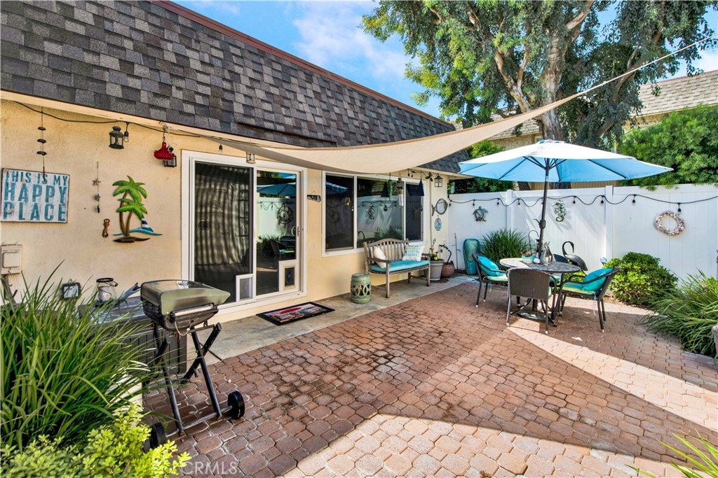 The possibilities for tomorrow are usually beyond our expectations and if you thought you’d missed your opportunity for home ownership, think again. This single level, end unit home, is a PUD (Planned Unit Development, assessed like a Single Family Home), in the Tiburon North community opens to a lush green belt, and invites you to enter, explore and smile. Natural light casts a glow and enhances the great room concept with living room, dining room and kitchen adjacent to each other. Showcasing the remodeled kitchen are abundant white cabinets, a breakfast bar with granite countertops, electric range, dishwasher, built-in microwave, recessed lights, and tile flooring. Just off the carpeted hallway is a full bath with tub/shower combination. Opposite the hall bath are two secondary bedrooms and the primary bedroom with ensuite bath and a walk-in shower. Adding to the charm, beauty and value of this property are central air conditioning, smooth ceilings, four ceiling fans, and mirrored closet doors. Walls of glass and sliding doors with Roman shades, blur the lines between indoor and outdoor living and issue an invitation to step outside. Dine al fresco or plant a garden. Life is meant to be celebrated and this private, beach themed patio is the perfect backdrop for relaxation and rejuvenation, whether it’s seclusion with a good book or raising a glass with friends and family while flipping burgers. The coastal vibe is accentuated with pavers and a shade awning. The 2-car garage with automatic garage door opener, offers washer-dryer hookups, and storage capabilities. The Tiburon North enclave features an adult pool, children’s pool and association clubhouse. The HOA dues covers the roof, exterior paint, common area maintenance, trash and provides a discount on Spectrum cable TV. Adjacent to Tiburon is shops, restaurants, health clubs and easy access to the 405 freeway. When moonlight fills the nighttime sky look up and give thanks. Your future just got made. Welcome home.