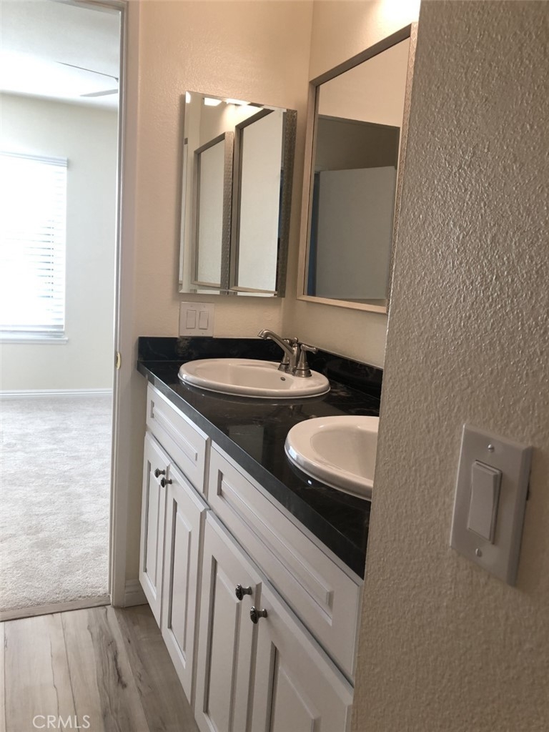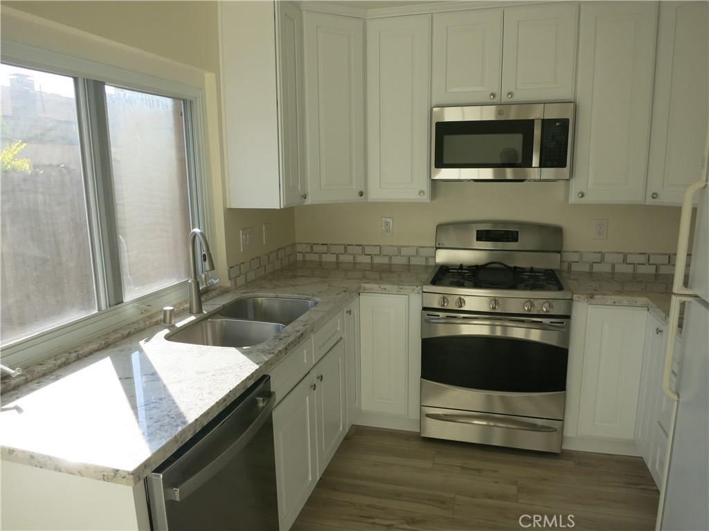 Completely remodeled and upgraded townhome in Fountain Valley’s gated Fountain Park Planned Unit Development (PUD) with swimming pool, clubhouse, BBQ area and countless greenbelt and walkways. This 2 BR, 1.5 BA, 1161 SF home w/2 car garage has it all including newly installed premium rigid core vinyl plank flooring that looks like natural wood, recessed lighting, fresh interior paint, dual pane windows and newer hardware throughout; spacious living room/dining area with fireplace, coat/storage closet and half bath with granite topped vanity; newly remodeled kitchen with garden window, white cabinets, MSI granite counters w/ backsplash, stainless steel sink, stove, microwave and dishwasher; adjacent breakfast nook with slider to private patio with newer composite decking for outdoor enjoyment; indoor laundry closet with hookups for full size washer and gas or electric dryer; stairway to upstairs landing with substantial linen/storage cabinet; 2 large bedrooms each with newly installed carpet and ceiling fans and dual closets; remodeled jack and jill bathroom with newer built-in vanity with granite counter, dual sinks and combo tub/shower. Fountain Park is conveniently located across Edinger from popular Mile Square Regional Park with 18-hole golf course, volleyball courts, sports fields, picnic areas, lake for fishing/boating and jogging/bike trails. Nearby schools include highly rated Thomas Paine elementary, Sarah McGarvin intermediate and La Quinta high school. Seller is providing a one-year home warranty.