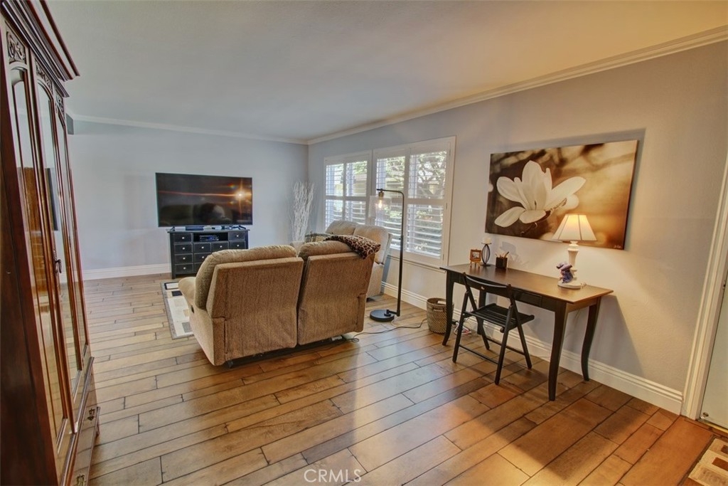 When you enter this home you will be totally taken in by its beauty. Quality abounds the entire home. This stunning remodel features hardwood floors throughout, dual pane windows with plantation shutters, designer accents including all new doors, plantation shutters, scraped ceilings, designer light fixtures and so much more. When you enter this home, you will be taken in my its beauty. The sunny bright kitchen and its spacious family area features beautiful shaker cabinetry with pull out drawers, designer hardware, granite counter tops, breakfast bar, recessed lighting, and top of the line stainless steel appliances. The dual pane sliding glass doors will take you an inviting spacious patio that is perfect for entertaining. The dining area opens to a spacious living room and features beautiful dual pane windows and plantation shutters. The stairwell has been upgraded with custom wood stairs and rail. The master bedroom is oversized and includes ample closets with custom wood sliding doors. The additional bedrooms are spacious and also include ample closet space with sliding wood closet doors.
