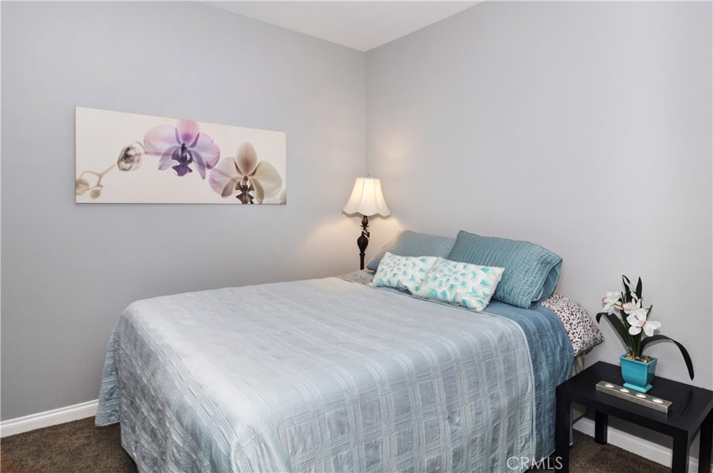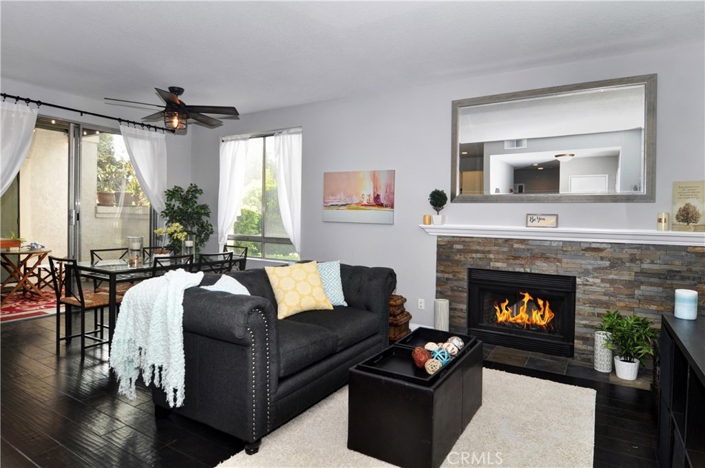 Located in the gated New Chase community, this secluded lower level condo is in a very quiet portion of the complex. It has been extensively remodeled, including rich dark hardwood floors and a custom stacked stone fireplace in the living area. Lush carpet in the bedrooms provide a cozy feel. The bathroom was completely renovated with a tiled shower and floor along with upgraded vanity and new light fixture. The master vanity has also been replaced along with new lighting and tile flooring. The master bedroom includes a large walk-in closet and sliding door patio access. The entire condo was recently painted including walls, ceilings, doors & baseboards. LED recessed lights were newly installed in the kitchen and hallway. The kitchen includes an upgraded tile floor and faces the dining area and living room to offer an open concept floor plan. The stacked washer and dryer are located in a hallway laundry closet for ultimate convenience and there is an additional storage closet in the rear of the patio as well. The New Chase community is nicely maintained with lush landscaping and a beautiful pool & spa with a BBQ area. The complex is also FHA loan approved. Great starter home - don't miss it!
