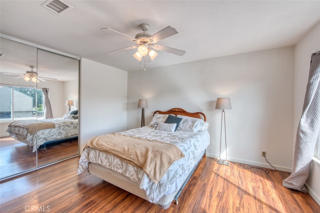 JUST LISTED IN THE GATED COMMUNITY OF FOUNTAIN PARK! This 3 bedroom, 1.5 bath two-level home offers nearly 1,400 sqft of interior living space and a quiet, inside-tract location. Features include dual-pane windows and sliders throughout, tile & laminate flooring, inside laundry with included washer/dryer, downstairs powder room for guests, and a cozy gas fireplace in the spacious main living area. Also includes an updated kitchen with granite countertops & backsplash, stainless steel appliances, recessed lighting, white shaker cabinetry and convenient nook for a small kitchen table. Just off of the kitchen is a private covered outdoor patio - perfect for parties & friends - and direct access to the large 2-car garage with roll-up garage door. Upstairs are three big bedrooms, the master at the back with mirrored wardrobe doors, overhead cooling fan, walk-in closet, and en-suite granite countertop vanity with shaker style cabinetry. The upstairs bathroom has been tastefully updated to match the master bedroom sink area and includes a second vanity, shower over tub and commode. Finishing the upstairs is a linen/storage closet at the landing and two additional large bedrooms. The Fountain Park community offers lots of greenbelts and mature landscaping, along with a community pool and clubhouse - all right across the street from the famous Mile Square Regional Park!
