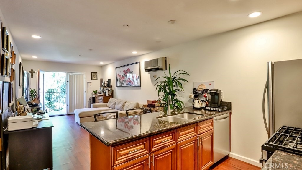 Redesigned 1 bed / 1 bath condo for the tastefully inclined. This 3rd floor unit is a perfect first home or investment! Stepping into the unit, you’ll be met with an open floor plan featuring wood laminate flooring and recessed lighting throughout. The kitchen has a convenient breakfast bar, and will include all of the stainless-steel appliances (refrigerator, gas stove, microwave & dishwasher), with ample cabinet space for storage. Headed down the hallway you’ll find an upgraded bathroom which with matching granite countertops, and a tub/shower combo. The unit also includes an in-unit stackable washer/dryer. The bedroom is quaint and bright and features a walk-in closet. Nestled in a lush, green, quiet, gated community with assigned parking and ample visitor parking just minutes from shopping, entertainment, freeways and anything you could possibly need.