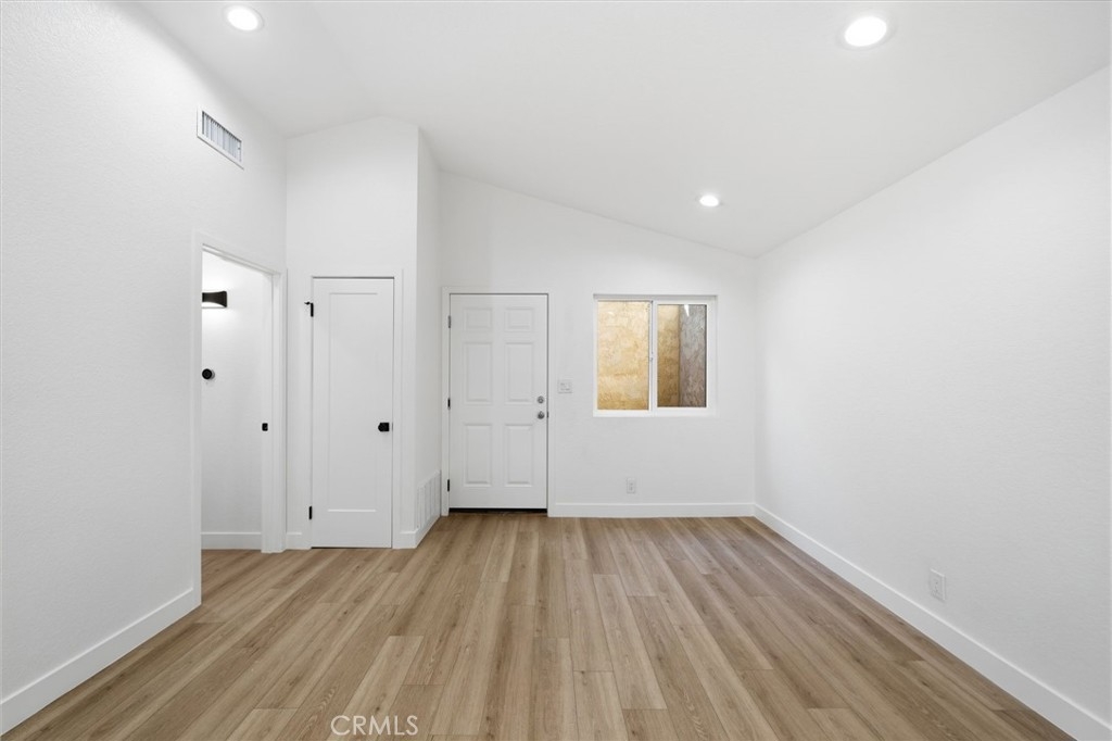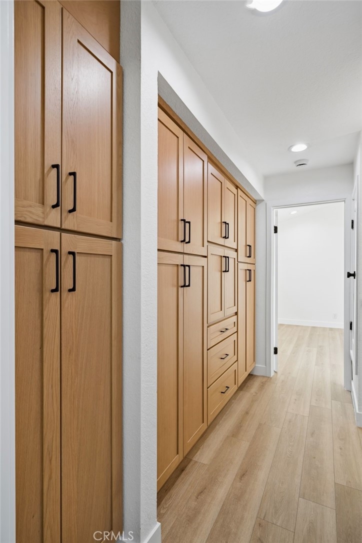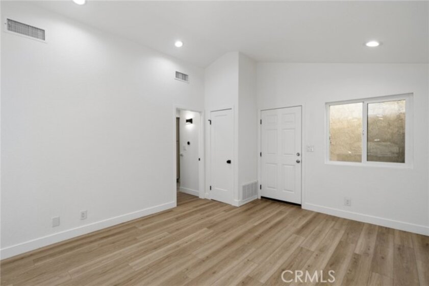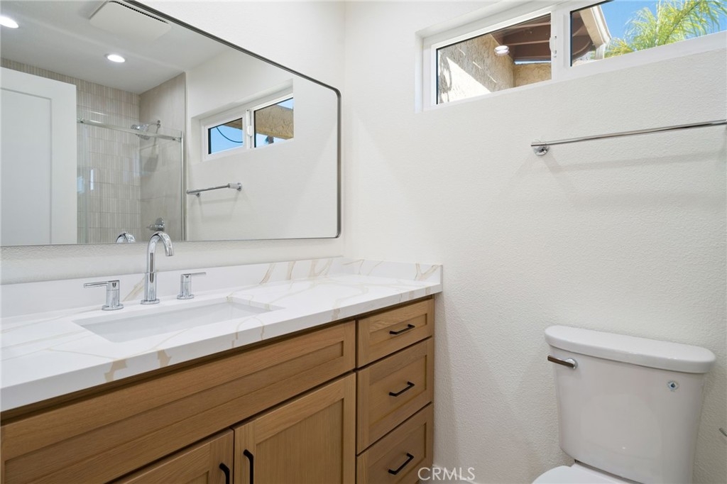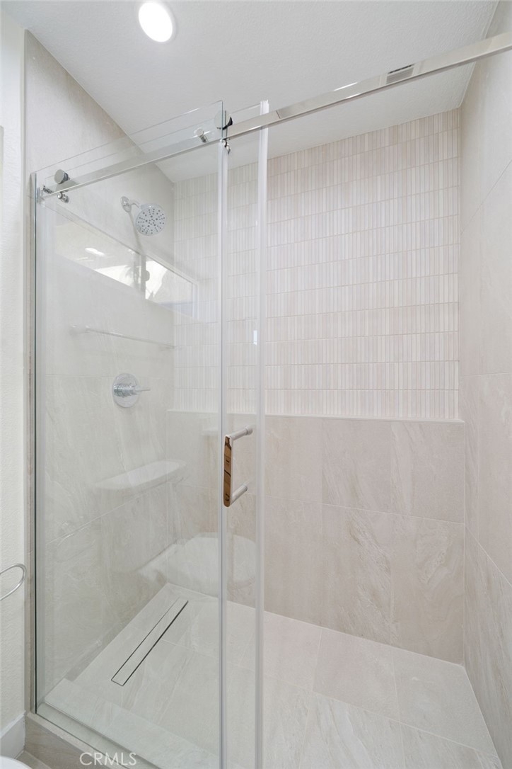 Welcome to this beautifully remodeled 1-bedroom, 1-bath condo in the highly desirable Fountain Crest Community, a rare opportunity featuring no neighbors below, offering enhanced privacy and quiet living. This thoughtfully upgraded home showcases modern finishes throughout, including durable SPC laminate flooring and a fully remodeled kitchen designed for both style and function. The kitchen features soft-close oak shaker cabinetry, Calacatta Gold quartz countertops, and a stunning waterfall peninsula that is perfect for cooking, casual dining, or entertaining. Brand-new stainless steel appliances complete the space with a sleek, contemporary touch. The bathroom has been elegantly redesigned with a floor-to-ceiling tiled shower, a full-length built-in shower ledge for convenient storage, and a quartz-topped vanity. The hallway closet features custom built-in cabinetry, maximizing storage while maintaining a clean and organized aesthetic. Additional highlights include in-home washer and dryer hookups, central air conditioning, and an oversized single-car garage conveniently located nearby. Residents of Fountain Crest enjoy resort-style HOA amenities, including a pool, spa, and outdoor cooking area, perfect for relaxing or gathering with friends and neighbors. Ideally located near top-rated schools, major freeways, shopping, and the expansive green spaces of Mile Square Regional Park, and just a short drive to the beautiful beaches of Huntington Beach, this home offers the perfect blend of comfort, style, and convenience.