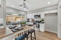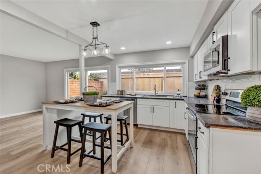 Venture into the Tiburon South community, down the winding streets lined with mature trees, lawns, greenbelts, playgrounds and pools to a cul-de-sac. There you will find this gem of a home, completely remodeled and located on a remote greenbelt that extends from a large lawn and tot lot. Tastefully upgraded throughout, this Balboa model offers 3 bedrooms, 2.5 bathrooms, 1536 sq.ft. of living space, and a spacious 2 car garage with washer dryer hook-ups. Enter the west facing red door to the living room with its wall of windows and luxury vinyl plank flooring that extends throughout the home. Walk past the powder room to the kitchen, an entertainers delight with new white shaker cabinets, soft close drawers, quartz countertops with a custom backsplash, newer appliances, a huge farmhouse sink and a walk in pantry. The adjoining space can be used as a family room or formal dining area, and it opens to a nice patio, nicely landscaped with 2 planters, pavers, and block wall fencing on both sides. The three bedrooms are upstairs, featuring a huge master suite with a wall of closets and 3/4 bathroom. All of the bathrooms have been remodeled with new cabinets, quartz countertops and new fixtures. Other features include Anderson dual paned windows, newer central air conditioning and water heater, and a water line to the refrigerator. Tiburon offers its residents 5 pools, kiddie pools, 2 clubhouses, and 2 tot lots. It is located near hospitals, restaurants, shopping, Mile Square Park's sport fields, recreation facilities and golf courses, and about 5 miles from the beach. All this AND award winning Fountain Valley School District!